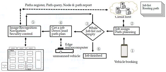 From Figure 6, we can see that there is a loose relationship between our unmanned vehicle and the cloud host, and its time dependence is not strong. The edge microcomputer checks the job list and downloads the route path before the vehicle starts and then registers the required path and reports the upcoming path section or workstation location. Image recognition and navigation control are handled by the edge microcomputer.