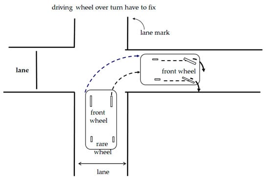 The most important aspect of vehicle navigation is controlling the vehicle to move stably in the lane and not to deviate from the lane. Our unmanned vehicle navigates by image recognition technology. A camera is installed at the front of the vehicle to capture images of the lane. The image captured by the camera is located approximately 150 cm in front of the wheel. There is a gap between the wheel and the image location, and the navigation control must include a feedback compensation mechanism. Otherwise, the vehicle is likely to deviate lanes. Let us take a corner turn for illustration purposes. When the vehicle makes a right turn, it turns right without calibration for 3600 milliseconds. During this period, most of the images captured by the camera are messy images at the intersection. We follow the inertial navigation of corner turn and do not perform image recognition during this period. After 3600 milliseconds, the system captures the image again. If the lane image does not exist, it will continue to turn until the lane image is captured. After completing the corner turn, when the camera captures the lane image, the front wheels are actually over-turned, as is shown in Figure 8.