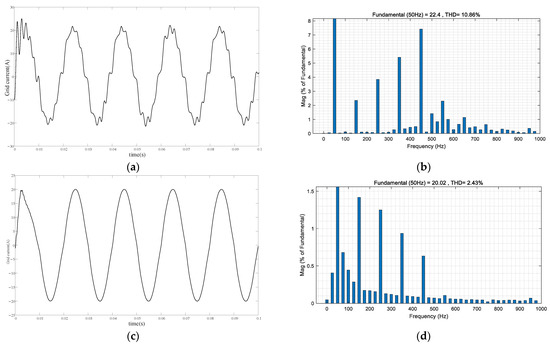 When the external environment changes in the simulated weak grid, the grid impedance increases so that Rg = 1 Ω, Lg = 14 mH, the corresponding SCR = 2.1, and the remaining parameters remain unchanged. The output steady-state grid-connected current waveforms and the corresponding harmonic analysis are shown in Figure 10.