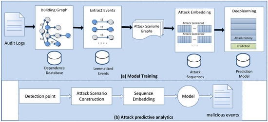 Figure 2 depicts the proposed malicious event prediction framework, which combines natural language processing and deep learning techniques integrated into the causal graph. The framework is divided into two components, based on the training of the deep learning model and the real-time working process: (a) deep model learning based on malicious event sequences and (b) predictive analysis of malicious events in real time.
