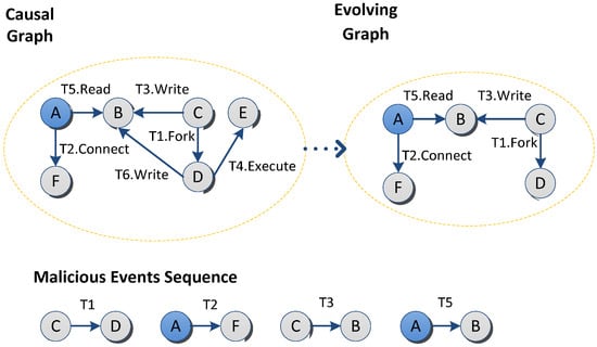 As shown in Figure 4, the complete causal graph is shown on the left, and the reduced 6-evolving graph is shown on the right at time point 6. Initializing malicious entity A as the detection point, the current time point was 6, i.e., the analyst detected malicious entity A at time point 6 and started the construction of the attack scenario based on the malicious entity. The highest priority was given to the event at time 5, and events after that time point were ignored because events after that time would not be causally related to any object in the current graph (malicious entity A). Similarly, the event at time 4 was ignored because this event was not causally related to any entity in the current graph (malicious entity A with entity B). Once the sequence of malicious events, shown at the bottom of Figure 4, was obtained, the causal chain was inferred, and the next temporal event that was likely to be causally related to detection point A was used as the prediction target (new malicious event).