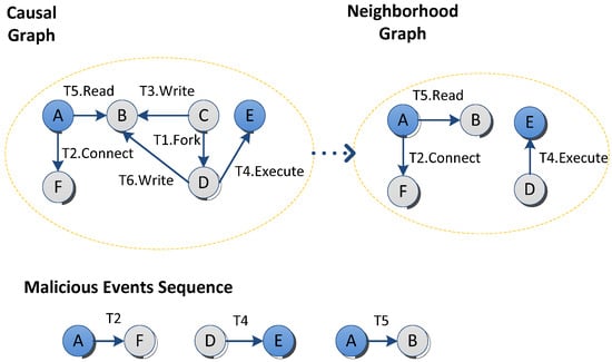 For example, in Figure 5, the full causal graph based on the set of two malicious entities {A, E} and the set of non-malicious entities {B, C, D, F} is given, corresponding to the malicious event sequence and the neighborhood graph. If the source or target node of the edge in the causal graph was a malicious entity, the event was marked as a malicious event, and the extracted malicious events could be converted into a sequence based on the timestamp order. The extracted malicious event sequence could be constructed as an attack scenario graph based on the neighborhood graph by keeping the sub-graphs about the malicious entities in the original causal graph. During the prediction of malicious events, the focus was on the next temporal event that was causally related to any malicious entity on the neighborhood graph (malicious events), as this was the target for prediction.