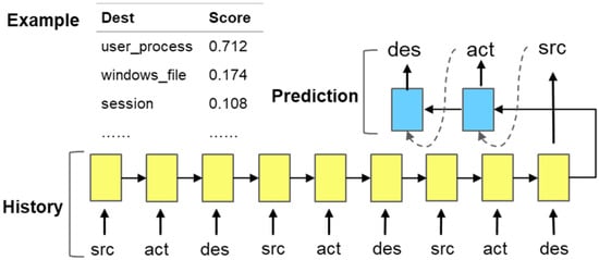 As a powerful artificial intelligence technology, deep learning has been widely applied in various fields such as computer vision, natural language processing, and bioinformatics. It can learn complex patterns and relationships and extract valuable information from large amounts of data. This makes it possible to combine with various traditional models and algorithm techniques, greatly improving the automation and efficiency of models. In recent years, it has also been used in threat prediction tasks based on various function environments. For example, Deeplog proposed by Du et al. [29] uses a deep neural network model with long short-term memory (LSTM) to model system logs as natural language sequences. However, although it makes predictions, it is essentially an anomaly detection model rather than a prediction model. If the error between the predicted and observed value vectors is within the high confidence interval of the Gaussian distribution, the parameter value vector of the incoming log entry is considered normal; otherwise, it is considered abnormal. Deepag [30] further proposes a new method for threat detection and attack path prediction using bi-directional deep learning based on Deeplog. Unlike the previous two methods, Tiresias [31] does not consider system logs but models security events themselves and demonstrates the feasibility of predicting security events through a recurrent neural network with recurrent memory cells, filling the gap in predicting the specific steps that attackers will take when carrying out attack activities. In addition, there are other examples of attack prediction, such as the prediction of system calls [32] and the combination of attack prediction and network security situation forecasting, using deep learning to predict different types of threats [33,34]. Prior to this, research on predicting attacks focused more on binary results. For example, Bilge et al. [35] proposed a system that analyzes the binary appearance logs of machines to predict which machines are at risk of infection, that is, whether attacks will occur.
