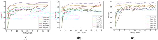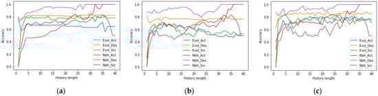 As shown in Figure 7 and Figure 8, the prediction accuracy for different prediction targets was given for historical event lengths of 1–40 in two different test sets. It can be seen that the overall prediction accuracy was higher in the APT-M-2 test set. For both test sets, a sufficiently long historical event length could significantly improve the prediction performance in most cases.