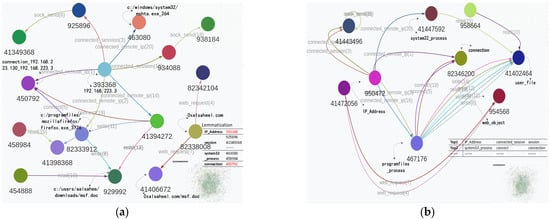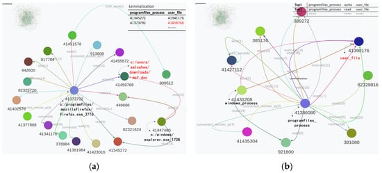 Case study based on a neighborhood graph. This is an example of malicious event prediction based on neighborhood graph and a temporary ID was randomly generated for each node. Compared to the example given in Figure 9, it contains more attack information. (a) The original neighborhood graph. (b) The neighborhood graph after lemmatization.