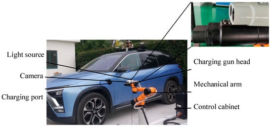 At present, some companies and research institutions have proposed their own solutions [,,,,,,,,,,]. These solutions show that the core of automatic charging of electric vehicles mainly consists of two parts: the identification and positioning of charging port (CP) and the plug-in mechanism. The identification and positioning of CP is the premise of plugging. Furthermore, the accuracy and universality of CP identification are important guarantees for the successful plugging of robots. Therefore, the high-precision identification and positioning of the CP is of great significance towards realization of automatic charging technology.