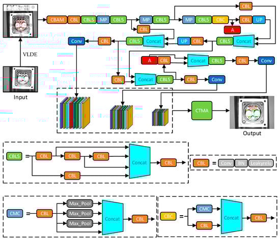 SFLDLC-CBAM-YOLOV7-tinp-CTMA network structure. CONV is the convolution operation, LeakyRelu is the nonlinear activation function, MP is the maximum pooling operation, Up is the upper sampling operation, Concat is the feature fusion function, and Maxpool is the maximum pooling operation. Note: The backbone of YOLOV7-tinp network is divided into four parts: Input, Backone, Neck, and Prediction.