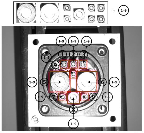 The RPS feature is unique and there is no mutual substitution relationship between the spatial positions. Therefore, the image is randomly scaled and clipped, and the Mosaic method is used to achieve data enhancement. The characteristic type and position of the CP have a coupling relationship during PPS. The determination of the label type is not based on the characteristics of the label type, but more importantly depends on the position relationship of the label. Therefore, when the data are enhanced, their location characteristics cannot be changed but can be zoomed, cropped, enhanced using the Mosaic data enhancement method, etc. The categories can be changed at the same time, but the original category characteristics of the feature do not change. In addition, this paper proposes a data enhancement method based on the SFLDLC, which enhances the ability of data generalization and improves the target recognition accuracy. In this paper, the round features of the CP from left to right, top to bottom, are defined as features 1 to 9, as shown in Figure 4.