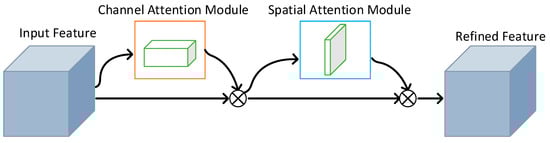 The CBAM is a convolution attention mechanism module that combines space and channels. As Figure 5 shows, given the intermediate feature graph as the input, the CBAM module will judge the attention graph in turn along two independent channels. Subsequently, it will multiply the attention graph with the input feature graph to optimize the features, which not only reduces the size and computation of the feature graph, but also improves the expression ability of the network. In order to extract the effective contour features of the target and obtain the main content of the target detection, the channel attention module is introduced, which is calculated as follows: