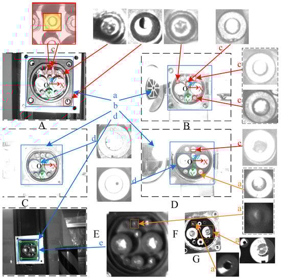 Complex scene analysis of CP. (A) CP category 1; (B) CP category 2; (C) CP category 3; (D) CP category 4; (E) Blurred image of CP at non focal length; (F) Partially enlarged view of (E); (G) Image of CP under sunlight; a, b, c, d, and e represent five difficulty categories, respectively.