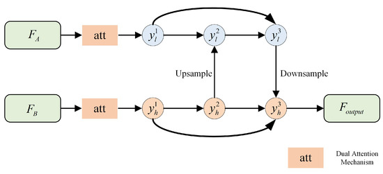 Finally, the outputs of the two modules were fused to obtain the final output feature map . Before the feature map is fused through the bidirectional cross-feature pyramid network, using the attention mechanism retains more effective information and avoids the interference of irrelevant features.
