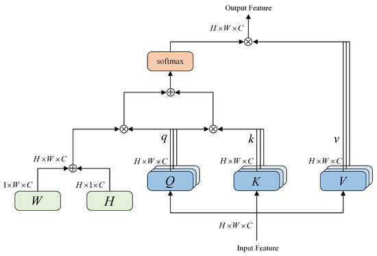 The self-attention layer does not include the location information coding of the two-dimensional image, which limits its expression ability in processing visual tasks. Therefore, when constructing the multi-head attention layer, two-dimensional relative position coding was added to improve the ability of the multi-head self-attention mechanism to understand two-dimensional images. Its structure is shown in Figure 4. The two-dimensional relative position coding considered the two-dimensional features of the image as a combination of vectors. It constructed vectors H and W to represent the relative positions of the two-dimensional features in the height and width directions, respectively. The constructed two-dimensional relative position coding can inject relative position information into each pixel when processing the two-dimensional features. Each attention head used a pair of trainable two-dimensional relative position codes, whose value depended on the distance between pixels and was constantly updated during the network training process to enhance the understanding of two-dimensional features.