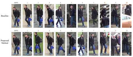 The Rank-10 retrieval results of the same query image using baseline and the algorithm in this paper on two datasets are shown in Figure 5 and Figure 6. The green number in the figure represents the correct query result, and the red number represents the wrong query result. As shown in the figures, the retrieval results of this paper’s algorithm achieved higher accuracy than the baseline.