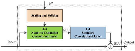In general, the weight of the convolution layer is considered to be a four-dimensional tensor W ∈ Rk×k×Cin×Cout, where k is the kernel size, Cin and Cout are the number of input and output channels, respectively. The weights in each convolutional layer can be regarded as Cout filters with Cin channels. In order to generate different feature maps according to the given dilation rate, we define the scaling factor γd ∈ R1×1×Cin×Cout and the migration scale βd ∈ R1×1×Cin×Cout to adjust the parameter W, where d represents the dilation rate, γd and βd is carried out according to the given dilation rate. The rate-adaptive scaling and shifting operations mentioned above are shown in Figure 4. The scaling and shifting operations include tensor broadcasting and βd as well as γd take on varying values depending on the given rate. The adjustment formula of W is as follows: