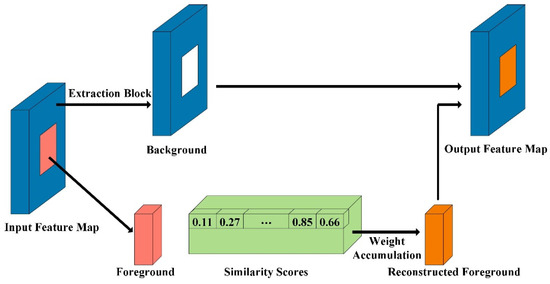 The CAM divides the input feature map into foreground patches and background patches and measures the similarity score by applying cosine similarity. Finally, Softmax [31] was used to normalize the cosine similarity. The illustration of the CAM is shown in Figure 5. The conventional CAM reconstructs the foreground patches by measuring the cosine similarities with the background patches. In contrast, the modified CAM uses the Euclidean distance to compute similarity scores. However, the normalization of the feature block vector in Formula (3) will distort the semantic feature representation and lead to distortion.