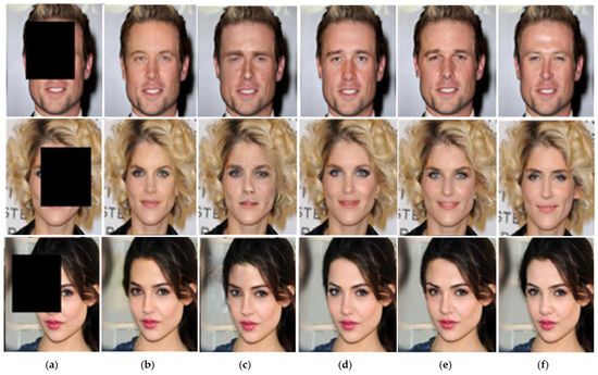 It can be seen from the comparison effect that after improving the CAM, the inpainting effect is more similar to the real image. Because the improved CAM takes the size of the feature block into account in addition to the vector angle of the feature block, the image’s overall semantic continuity and local semantic continuity have both significantly improved, and the smoother facial lines and muscle texture are clearly visible. Additionally, it indicates that the improved CAM is better suited to handle the relationship between the background and the defect area.
