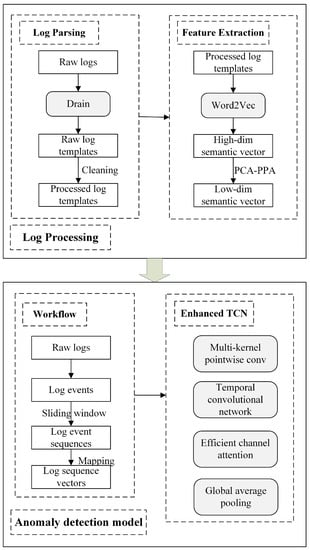 In this section, we describe the proposed ETCNLog method in detail. The ETCNLog framework is presented first. After introducing the framework, we suggest a log processing step to convert the raw logs into log sequence vectors. Finally, ECA and a TCN are used to learn log sequence relationships and perform log anomaly detection by modeling.