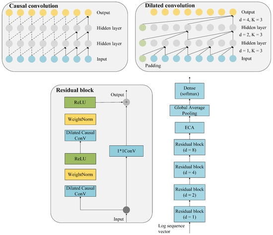 In this paper, we propose a novel method, ETCNLog, to handle a longer sequence log. First, a cleaning step is introduced to the Drain [], which improves the parsing of semi-structured logs and offers a solid foundation for subsequent anomaly detection []. Using efficient channel attention (ECA) and a TCN as its foundation, ETCNLog is an anomaly detection model consisting primarily of dilated convolution, residual blocks and an efficient channel attention module []. An important advantage of a TCN is that it has a large receptive field to model the long-term dependencies of the logs. Combined with ECA, the model can automatically learn the importance of different log event sequences and detect hidden dependencies within sequences. Moreover, it improves the effect of time series feature learning to achieve high accuracy for longer sequence log anomaly detection. The major contributions are summarized as follows: