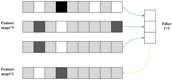 - The residual block is enhanced by adding multiple convolutional kernels to enrich the underlying feature representation. On the other hand, pointwise convolution in MobileNet [] is employed in TCN architecture to create a model with fewer parameters. The pointwise convolution operation creates a new feature mapping by performing a weighted fusion of many feature mappings from the preceding layer. Figure 5 shows three one-dimensional feature mappings are fused into a new feature mapping by a 1*3 kernel;