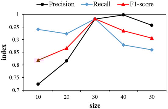 We calculated the Precision, Recall and F1-score metrics for different size values in turn. To better observe the influence of the hyperparameter size, we plotted the variation of the Precision, Recall and F1-score values with the size, as shown in Figure 6 below.