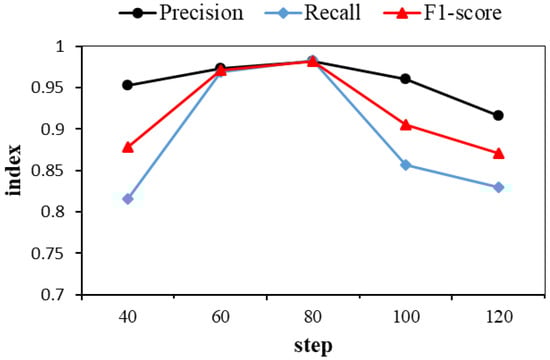 Precision, Recall and F1-score were calculated sequentially for different values of step. To visualize the effect of the step on model performance, we plotted Figure 7 to show the changes.