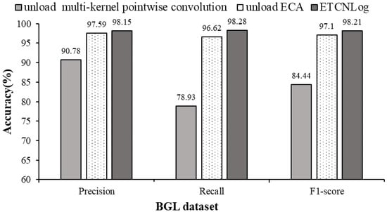 Two sets of comparison experiments were set up in this paper to analyze the effect of the innovations proposed in the model. In the two sets of comparison experiments, the multi-kernel pointwise convolution and the ECA module were not loaded, respectively. Other processes were kept the same as the original experiments, and the experimental results on the BGL dataset are shown in Figure 8 below.
