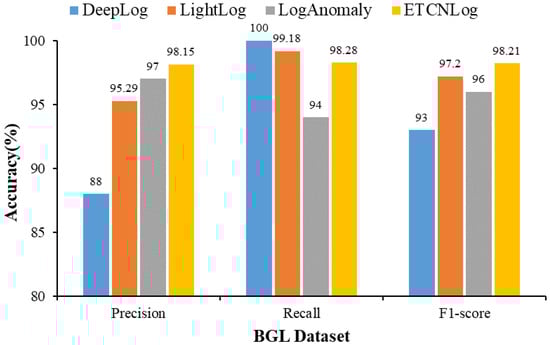 In this paper, three log anomaly detection methods, DeepLog, LightLog, and LogAnomaly, were selected as benchmarks to evaluate the performance of ETCNLog. Figure 9 displays the comparison results of different models.