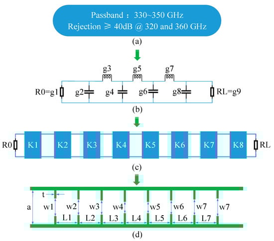 Design flowchart of 340 GHz terahertz filter. (a) Required technical indicators; (b) Prototype circuit of the 7-order Chebyshev response low-pass filter; (c) K-invert converters; (d) 7-order inductive diaphragm waveguide filter.