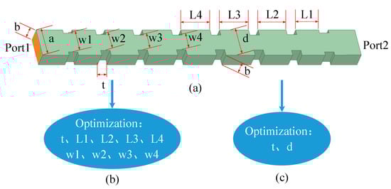 Conspicuously, it can be concluded that the bandwidth of the filter is mainly affected by the coupling window. Here, t will change the bandwidth of the filter while changes to the center frequency are small; w1~w4 will change the bandwidth of the filter, but the center frequency will be significantly affected.