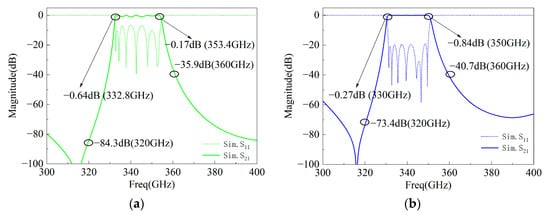 Simulation results of 340 GHz terahertz filter: (a) based on theoretical values; (b) based on HFSS optimization values.