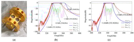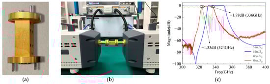 As shown in Figure 4a, its overall structure is red copper with a conductivity of 3.5 × 107 S/m, copper surface electroplated with 2 µm gold. The test environment is shown in Figure 4b, and the simulation and measurement results of the terahertz filter are shown in Figure 4c. The measurement results indicate that the center frequency (CF) is 330 GHz, the bandwidth (BW) is 12 GHz, the RL is less than 15 dB, and the in-band IL is less than 1.8 dB. Compared with the simulation results or the needed technical indicators in Figure 1a, the CF and BW errors of the terahertz filter are 10 GHz (~3.03%) and 8 GHz (~40%), respectively, and there is a very large performance error.