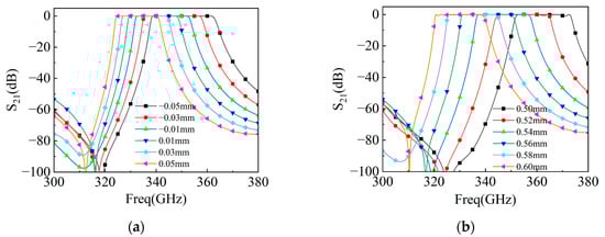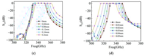 As shown, S21 changes with the length L1~L4 of the seven resonators in Figure 7a; if L1~L4 increase synchronously by −0.05~0.05 mm in Figure 2a, the bandwidth of the filter will change from 24 GHz to 16.2 GHz, and the center frequency will change between 350.4 and 332.55 GHz. As shown, S21 changes with the width d of the seven resonators in Figure 7b; if d is changed between 0.5 and 0.6 mm in Figure 2a, the center frequency of the filter will change between 367.65 and 329.85 GHz, and the bandwidth will change between 20.5 and 19.7 GHz.