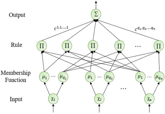 In this formula, represents the membership function that represents the fuzzy semantic . The expression means the membership degree of the -th sample for the fuzzy proposition “”. The symbol represents the fuzzy intersection operator, which means “”. Therefore, the activation strength represents the degree to which the input data meets the preconditions of the rule “”.