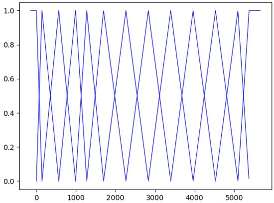 Step 4: For each merged region, we take the center of the region as the vertex of the membership function, and the center of the adjacent region as the endpoint of the membership function to construct a triangle membership function. For the two regions on the edge, the left and right endpoints of their corresponding membership functions are and , respectively. Then, we will obtain membership functions ; each membership function represents a semantic . Figure 2 shows the trigonometric membership function cluster obtained by merging some inputs.