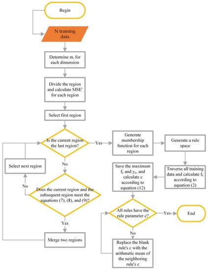 In contrast to the ordinary Wang–Mendel method, our proposed improvement involves adding pruning operations consisting of Steps 2, 3 and 4. The ordinary Wang–Mendel method employs triangle membership functions to uniformly cover the data, without considering the regional differences within the data. In our approach, we first partition the input data into uniform regions, and then evaluate the influence of each region using variance analysis. We combine adjacent regions with low influence to form larger regions, for which we then obtain a membership function. This method reduces the number of rules and accelerates the training speed. Our experiments show that the modified Wang–Mendel method reduces the training time by more than half compared to the ordinary Wang–Mendel method. The flowchart of the Modified Wang–Mendel Method is presented in Figure 3.