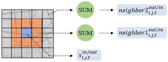 where is the eight adjacent grids of , and is the sixteen grids separated by one grid from , as shown in Figure 5. If the or the grid exceeds the map boundary, we set the inflow or outflow corresponding to the grid to 0.
