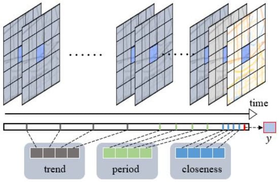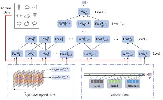 Although many data-driven models, such as Deep Spatiotemporal Network (DeepST) [], Spatiotemporal Residual Network (ST-ResNet) [], Attention Convolutional Long Short-Term Memory Network (AttoConvLSTM) [], Diffusion Convolutional Recurrent Neural Network (DCRNN) [], Attentive Crowd Flow Machine (ACFM) [] and Attentive Spatio-Temporal Inception ResNet (ASTIR) [], have achieved excellent results in traffic flow prediction problems, the interpretability of these models is still an open issue, because these models are based on deep neural networks, which have “black box” characteristics. Although these models have superior performance, they often come at the cost of high model complexity, and their results cannot be easily explained or understood by humans []. When traffic flow prediction is applied to safety-related fields, such as emergency management, the consequences of prediction errors can be catastrophic; therefore, the interpretability of the model is a critical factor to be considered.