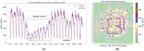 (a) Visualization inflow and outflow in February 2016; (b) flow heatmap on 13 February 2016.