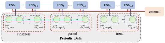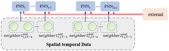 The integral framework of the Spatial-temporal data module is shown in Figure 9. We take the and of the past time slots for time to represent the data spatial-temporal dependence, where . We feed to the first FNNs with a sliding window of size 2, and to the following FNNs. Meanwhile, we feed external data that includes to each FNN. For the BikeNYC dataset, the external data only includes .