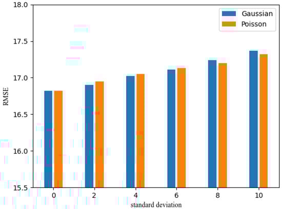 The x-axis of Figure 11 represents the standard deviation of the Gaussian and Poisson perturbations, with larger values indicating stronger noise interference, and 0 representing no noise. We observed that the model’s accuracy remained stable under various intensities of noise. Even when adding Gaussian perturbation or Poisson perturbation with a standard deviation of 10, the model’s RMSE only increased by 3.27% or 2.97%. These results confirm the model’s excellent anti-noise ability, which is due to the combination of multiple modules and fuzzy rules.