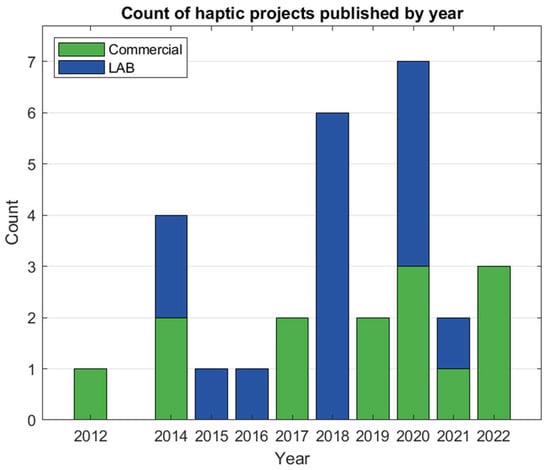 Figure 1 shows the number of published studies included in this paper by year. Most papers are from 2018 and 2020 and there are a few more recent papers from 2021 and 2022. Table A1 (Appendix A) shows the academic and commercial haptic systems.