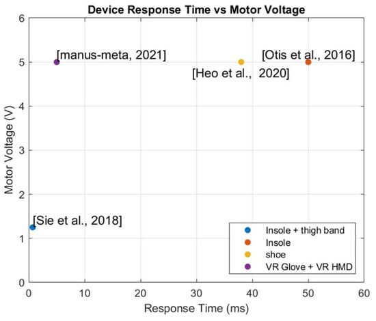 There are a variety of actuation technologies that can be used to generate haptic feedback. Table 2 shows an overview of the haptic types and actuators. Mechanical actuators use a source of power to achieve physical movement. Mechanical actuators can be found on nearly every automated machine. The three main types of actuators are pneumatic (air pressure), hydraulic (fluid pressure), and electric []. An example of mechanical actuators is the pair of kinesthetic shoes found in [] that uses pneumatic actuators to allow the smart shoe to operate passively by opening selected valves based on the height profiles controlled by the desired terrain features. This allows the corresponding bladders to deflate as the user steps on the shoe and to reinflate when they lift their foot during the swing phase of gait.