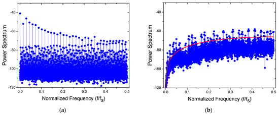 To alleviate the nonlinear distortion from the mismatch, various mismatch-shaping techniques have been investigated, and the element rotation has been found to be one of the simplest and most effective methods [15,16]. In the element rotation, capacitor array elements are used in sequence in successive operations of the C-DAC. For example, if C1 to C3 were used in the n-th conversion and four capacitors were used for the (n + 1)-th conversion, C4 to C7 are selected. It is known that, if element rotation is used, the error power is not concentrated at the harmonics of the input signal and the error spectrum undergoes 1st order shaping, of which the mismatch transfer function (MTF) is Therefore, the low-frequency component of the error signal is greatly suppressed. If the element rotation technique is used with the oversampling technique, the total in-band error power can be greatly reduced. Figure 3b shows the power spectrum of the error signal when the element rotation was employed. We can observe the absence of strong harmonic components observed in Figure 3a and the suppression of the low-frequency components by the mismatch shaping clearly. In Figure 3b, the red curve represents the predicted 1st order MTF. We observe good agreement between the MTF and the behavioral simulation results.