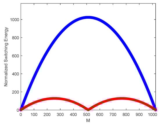 Normalized switching energy of the 2-level (blue) and 3-level (red) switching schemes (N = 1024).