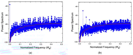Figure 6 shows the power spectra of the error signals from MATLAB behavioral simulations of the split-array C-DAC employing the element rotation (N = 16). The capacitor mismatch distribution used for the simulations for Figure 3 was used in the simulations (i.e., normal distribution with 1% standard deviation). Figure 6a shows the spectrum when the two-level switching was used. We can observe the mismatch error-shaping from element rotation. We also observe a relatively large dc offset component as predicted by Equation (10). Figure 6b shows the spectrum from simulations with the three-level switching. Here, we observe the signature of a strong mismatch error shaping. However, we also observe strong distortion components at the harmonic frequencies of the input signal.