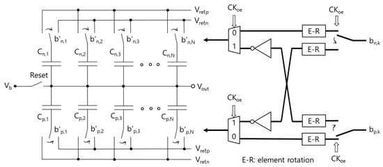 Figure 7 shows the schematic diagram of a C-DAC employing the proposed switching scheme. bn,k and bp,k are the thermometer coded input. “E-R” represents element rotation. CKoe indicates whether the current conversion is an odd- or even-numbered one. CKoe can be simply produced by dividing the master operation clock by 2. When CKoe = 0 (i.e., even-numbered conversion), bn,k and bp,k are connected to b′n,k and b’p,k, respectively. When CKoe = 1 (i.e., odd-numbered conversion), bn,k is connected to b′p,k and bp,k is connected to b′n,k. The inverters in the “cross-paths” are used to change the role of “down capacitors” and “up capacitors”. Four element rotation processors are used: the positive and negative sub-arrays have two processors each to process the element rotation for direct and cross-connections separately.