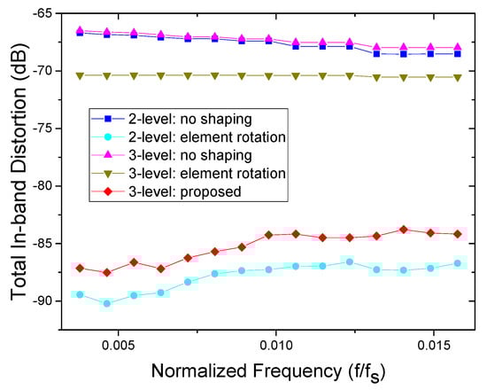 Figure 9 compares the in-band mismatch error power from various switching schemes. MATLAB behavioral simulations were repeated while varying the input frequency. When no mismatch error shaping is applied, the total in-band distortion is very high (>−67 dB). When the simple element rotation is applied to each sub-array independently, the two-level switching produces very low distortion error, which is around −90 dB at low signal frequencies. When the three-level switching is used with the simple element rotation, it suffers from mismatch between the positive and negative sub-arrays and produces large distortion of about −70 dB. Finally, we observe that the distortion from the three-level switching is drastically suppressed by using the scheme proposed in this work, where the role of the positive and negative sub-arrays is switched per cycle. We can also observe that the in-band distortion from the proposed scheme is still larger by about 3 dB than those from the two-level switching with element rotation, which is actually smaller than predicted from the change in the mismatch transfer function described above.
