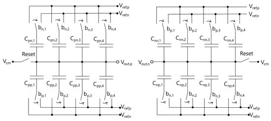There are two methods to switch the capacitors of the C-DAC of Figure 4. In the first method, both the Cn,k array and Cp,k array are switched to produce the output. For example, if M out of N capacitors of the Cp,k array are used to raise Vout, then (N − M) capacitors of the Cn,k array are used to lower Vout. Then, the output voltage can be expressed by
