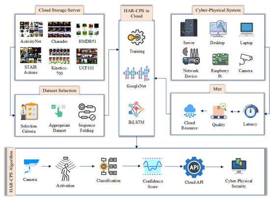 A GoogleNet–BiLSTM hybrid network is employed as the classifier in the proposed HAR-CPS algorithm. A video dataset is necessary for this type of hybrid network. In this section, we explain the HAR-CPS algorithm, along with the video dataset selection criteria, dataset processing, network design, the HAR-CPS method’s operating principle, and mathematical interpretations. Figure 1 provides a visual summary of the proposed approach.