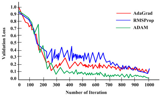 where and refer to the updated value of the weight at time step and t, respectively. in Equations (2) and (3) is the learning rate. In Equation (2), is the loss function. Both Equations (3) and (4) contain , which adds a small constant to prevent division by zero. in these equations is the exponentially decaying average of the squared gradients at time step t. The loss function in Equation (3) is measured by . and in Equation (4) represent the first moment and learning rate, respectively. The learning algorithms adjust the weights of the hidden nodes of deep neural networks. The more efficient this process is, the better the performance of the trained network becomes. We experimented with all three of the aforementioned algorithms and analyzed the performance using a validation loss curve illustrated in Figure 3.